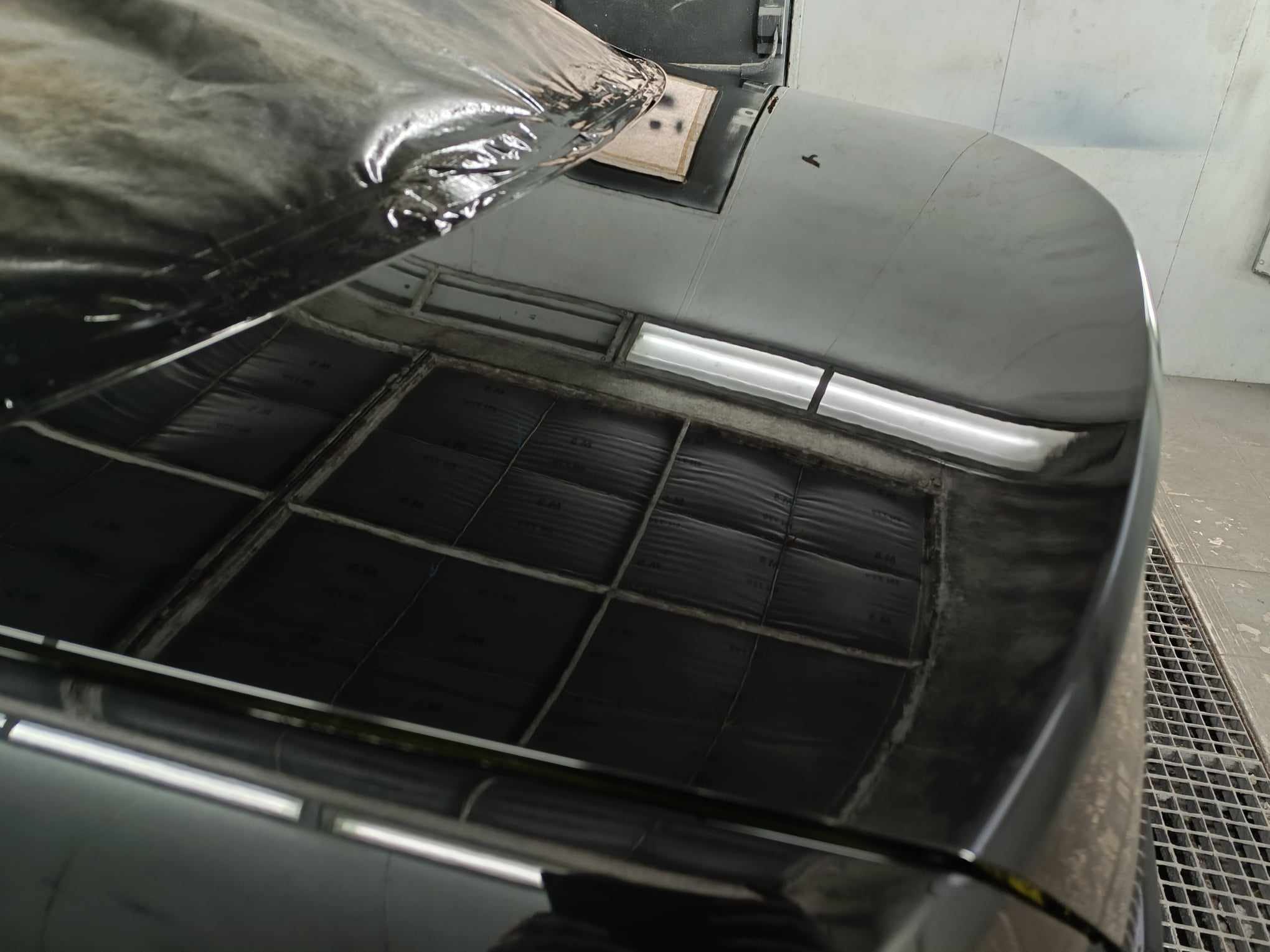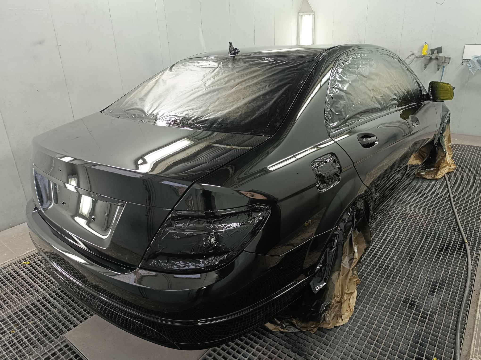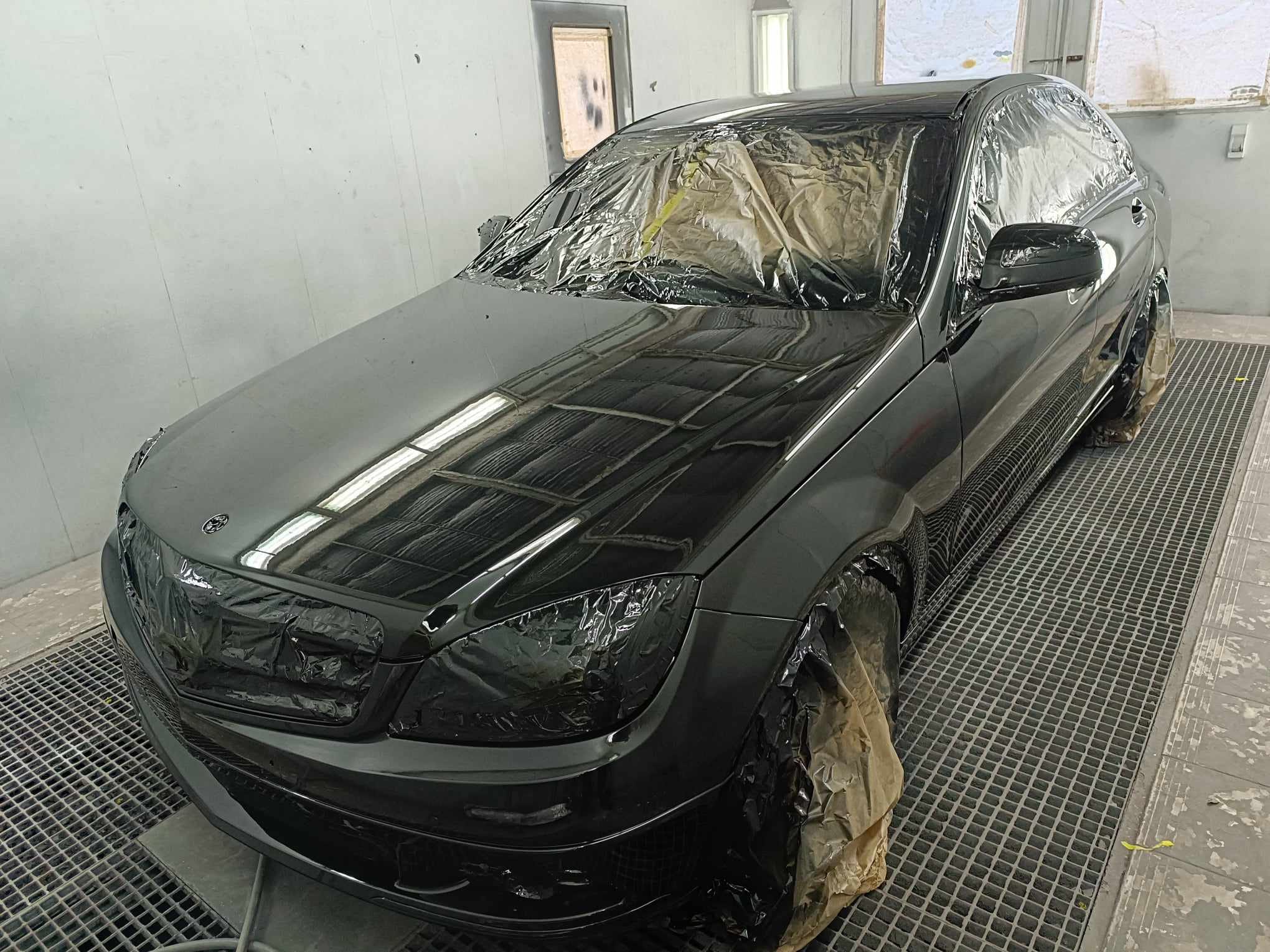 Une peinture complète réalisée dans les règles de l'art pour cette berline de luxe. Le défi était d'obtenir un noir profond sans aucune imperfection (peau d'orange), suivi de l'application d'un vernis UHS (Ultra High Solid) pour une protection maximale et une brillance miroir. Ce projet souligne notre rigueur dans le masquage et la préparation en cabine pressurisée.